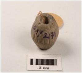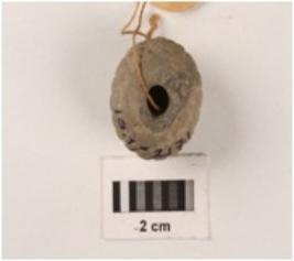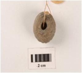 | Description / विवरण | Terraoctta bead, biconical shape, rough surface, grey in colour with perforation and vertical incised design on surface. |