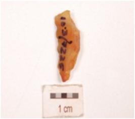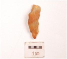 | Description / विवरण | A blunted blade made on carnelian flake, partly broken along one end, blunted one lateral side and other side sharp with retouches. |