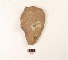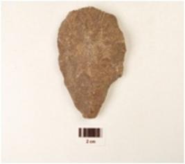 | Description / विवरण | A quartzite hand axe made on end struck flake, flake scars on the surface, bi convex cross section, wavy cutting edges on the surface. |