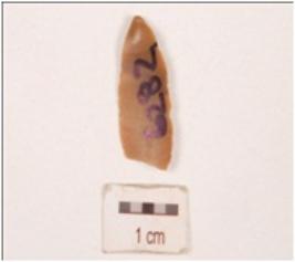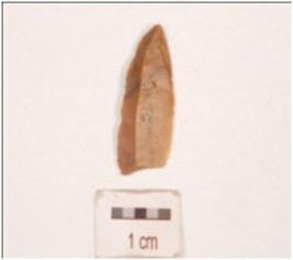 | Description / विवरण | Chert blade, prepared platform, prominent bulb, flake scars on one side, triangualr cross section and user marks along cutting edge. |