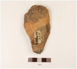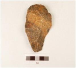 | Description / विवरण | A quartzite hand axe made on side struck flake, bi convex cross section, flake scars on the surface, wavy cutting edges, one end slightly broken. |
