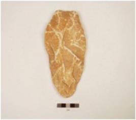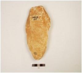| Description / विवरण | A quartzite hand axe made on flake, flake scars on the surface, unifacial, plano convex cross section, wavy cutting edges. |