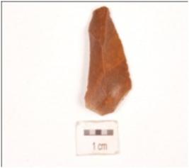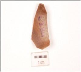 | Description / विवरण | Chert blade, triangular in cross section, prepared platform, diffused bulb on ventral side and use-wear marks along the cutting edges. |