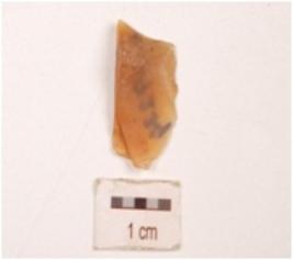 | Description / विवरण | Fragment of utilized flake, made on chalcedony flake, use-wear marks along the sharp edges and raw material given heat treatment. |