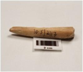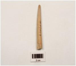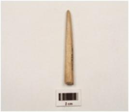 | Description / विवरण | A bone point with tapered end, pointed one end slightly damaged other end broken, circular cross section, polished surface. |