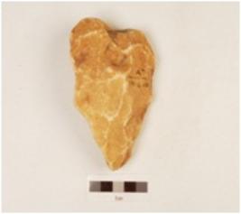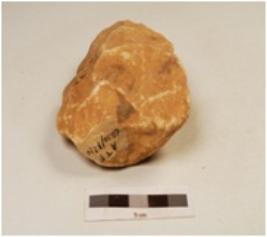 | Description / विवरण | A quartzite hand axe made on side struck flake, flake scars on the surface, diffused bulb on the ventral side, platform on the proximal end, bi convex-cross section, wavy cutting edges. |