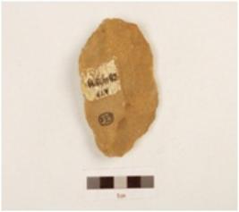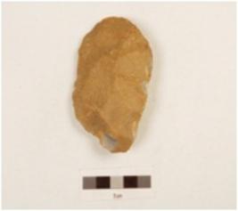 | Description / विवरण | A quartzite hand axe made on side struck flake, flake scars on both sides, bicone section, slightly chipped off surface. |