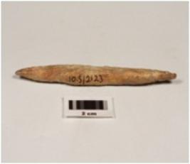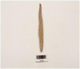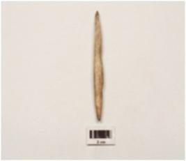 | Description / विवरण | A bone knitter with both end pointed uneven surface, slightly polished, incised decoration at one end. |
