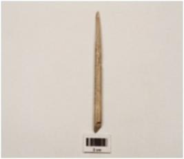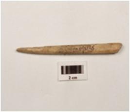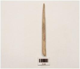 | Description / विवरण | Fragment of bone point, polished surface slightly chipped off, circular cross section, pointed end slightly damaged, other end broken. |