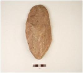 | Description / विवरण | A quartzite hand axe made on side struck flake, flake scars on the surface, prepared platform on the proximal end, plano convex cross section, wavy cutting edges. |