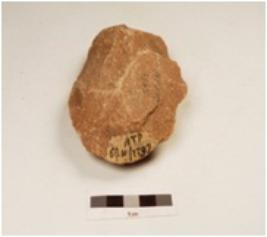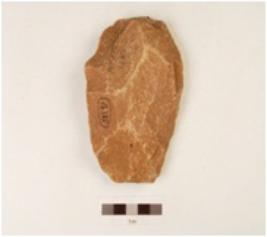 | Description / विवरण | A quartzite hand axe made on end struck flake, flake scars on the surface, diffused bulb on the surface, one end slightly broken, bi convex cross section, wavy cutting edges. |