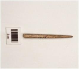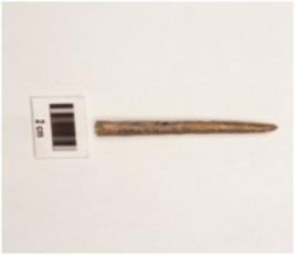 | Description / विवरण | Fragment of bone point with polished surface, circular cross section, brownish colour pointed end slightly damaged, other end broken. |