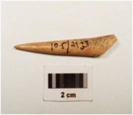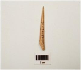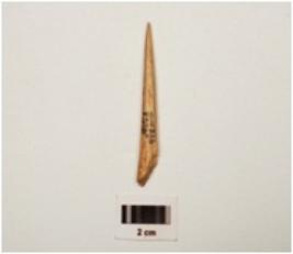 | Description / विवरण | Fragment of a bone point, one end is sharp pointed and other end is partly broken, and circular cross section well polished surface, |