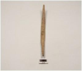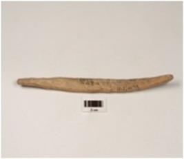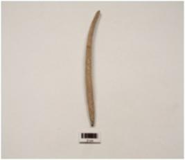 | Description / विवरण | A bone knitter with narrow ends, flat surface, slightly curved, mended from one side, partially polished surface. |