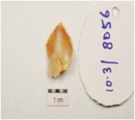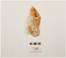 | Description / विवरण | A flake made on chert, irregular in shaped, smooth surface, and marks on the cutting edges, pointed one side. |