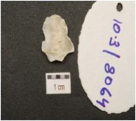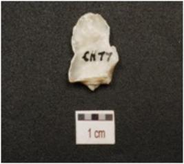 | Description / विवरण | A utilized flake made on end struck chert, bulb on the ventral side, and prepared platform on proximal end. |