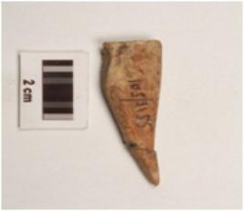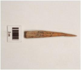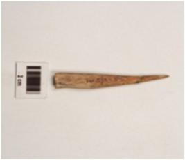 | Description / विवरण | Fragment of bone point with slightly curved pointed end, mended surface, rectangular cross section, polished surface. |