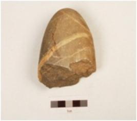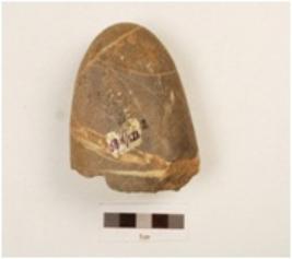 | Description / विवरण | A chopper made on quartzite pebble butt end with oval section, natural white coloured lines on the surface, cortex is visible. |