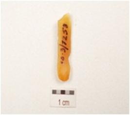 | Description / विवरण | A blade made on chalcedony with prominent mid ridge on dorsal, bulb on ventral, prepared platform, triangular in section broken along distal end raw material given heat treatment and use wear marks on cutting edges. |