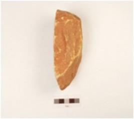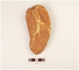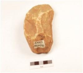 | Description / विवरण | A sandstone hand axe made on pebble, cortex visible at butt end, flake scars on both sides. |