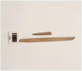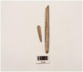 | Description / विवरण | Fragment of bone point Two pieces , pointed end slightly damaged, other end broken, three ridges on surface, polished surface, incised lines on surface. |
