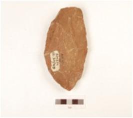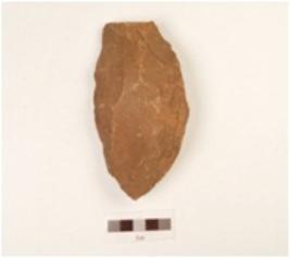 | Description / विवरण | A hand axe made on quartzite pebble, small flake scars on both sides biconvex section, preapred platform at proximal end. |