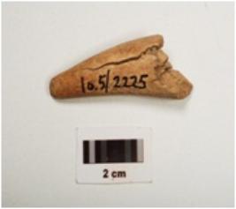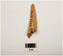 | Description / विवरण | Fragment of a point on horn with modifide and well polished surface, pointed towords one end, thicker and broken other end, brown in colour. |