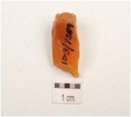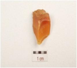 | Description / विवरण | A borer made of carnelian with mid ridge, triangular in section,slightly broken tapering pointed tip and use wear marks on cutting edge. |
