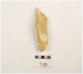 | Description / विवरण | A blade made of chalcedony with double ridge on dorsal, trapezoidal in section, use wear marks on cutting edge and pointed along distal end. |