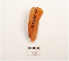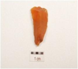 | Description / विवरण | A blade made of carnelian with mid ridge on dorsal, triangular in section, striking platform and use wear marks on cutting edge. |