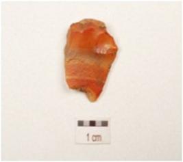 | Description / विवरण | A side struck flake made of carnelian with striking platform, slightly chipped off dorsal, use wear marks on edges and flattened section. |