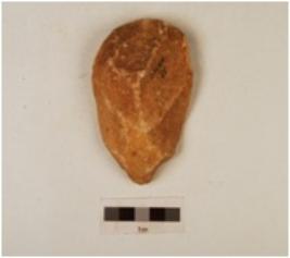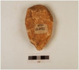 | Description / विवरण | A hand axe made on quartzite side struck flake, use wear edges, flake scars on surface, plano convex in section. |