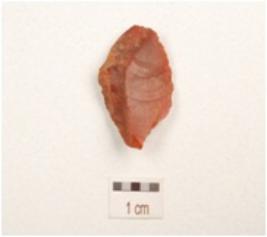 | Description / विवरण | A end struck flake made of carnelian with striking platform, bulb on ventral, triangular in section and use wear marks on edges. |