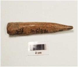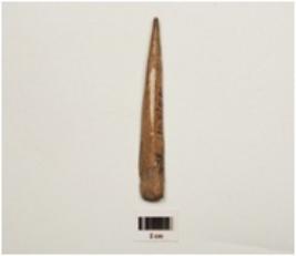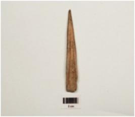 | Description / विवरण | A bone point, one end is pointed and tip is slightly chipped off, other end is broad, groove on one side, well polished surface, |