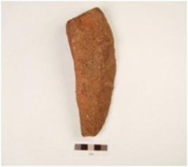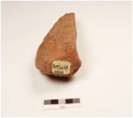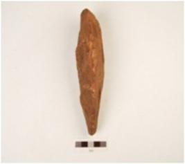 | Description / विवरण | A bifacial handaxe, made on quartzite end struck flake with prepared platform, flake scars on both sides, sharp thick butt end and pointed along other end. |