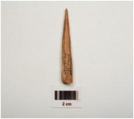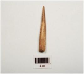 | Description / विवरण | A bone point with polished surface pointed one end, broad other end and circular cross section. |