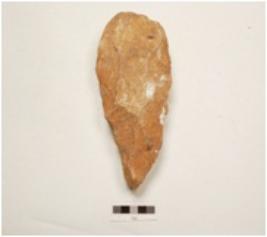 | Description / विवरण | A handaxe made of quartzite end struck flake, round butt end, pointed other end, cortex on butt end, wavy cutting edge, flake scars on both surfaces and plano convex in section. |