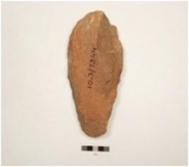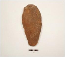 | Description / विवरण | A handaxe made of quartzite end struck flake, round butt end, intact other end, wavy cutting edge, flake scars on both surfaces and plano convex in section. |