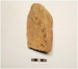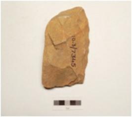 | Description / विवरण | A rectangular shaped cleaver made of quartzite, end struck flake, flat broad cutting edge, flat butt end, flake scars on one surface and triangular in section. |