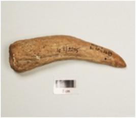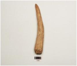 | Description / विवरण | Fragment of a point on horn-core with modifide and well polished surface, pointed towards one end, thicker and broken other end, brown in colour, |
