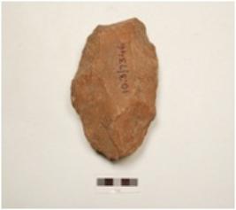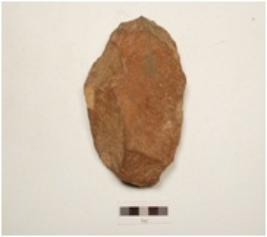 | Description / विवरण | A ovate shaped handaxe made of quartzite side struck flake, wavy cutting edge, flake scars on both surfaces and plano convex in section. |