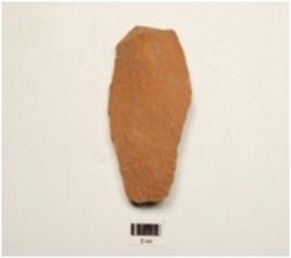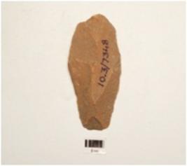 | Description / विवरण | A miniature handaxe made of quartzite end struck flake prepared surface, flat broad butt end intact other end, wavy cutting edge, flake scars on dorsal surface and triangular in section. |