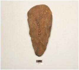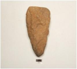| Description / विवरण | A handaxe made of quartzite end struck flake, flat broad butt end, pointed other end cortex on butt end, wavy cutting edge, flake scars on both surfaces and plano convex in section. |