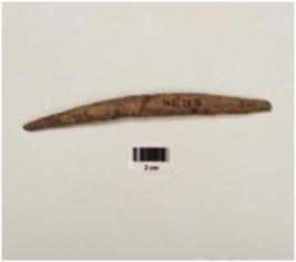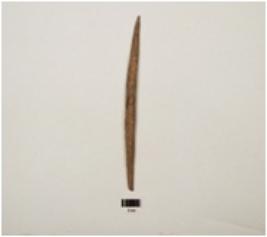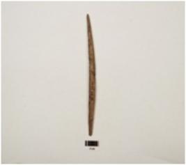 | Description / विवरण | A bone knitter with smooth and partly broken surface, pointed from both ends and thick from middle, slightly curved and brown in colour, broken and mended. |