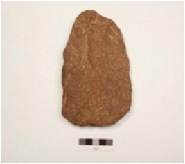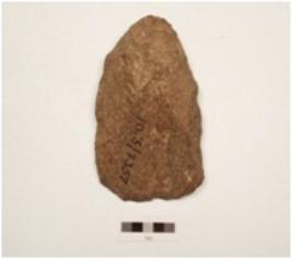 | Description / विवरण | A v-shaped cleaver made of quartzite end struck flake, flat broad cutting edge, partly retouched on cutting edge, flake scars on both surfaces and plano concave in section. |