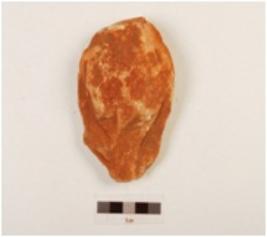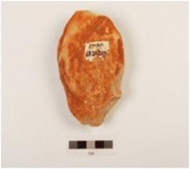 | Description / विवरण | A hand axe made on quartzite end struck flake, prepared platform, flake scars on one surface, made on cortex, irregular wavy edges, biconvex in section. |