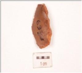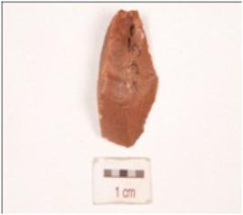 | Description / विवरण | Chert end struck flake, prepared platform, prominent bulb on ventral side. |