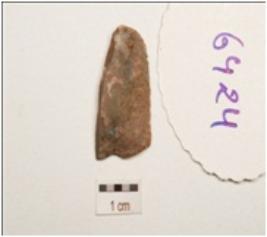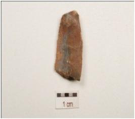 | Description / विवरण | Fragment of a balde made on chert, prominent bulb on ventral side, double ridge on dorsal side, trapezoidal in section distal end is broken use wear marks along the cuttine edge. |