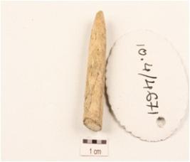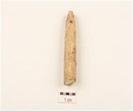 | Description / विवरण | Bone point, proximal end broken, circular cross section, blunt pointed end, smooth and polished surface. |