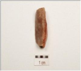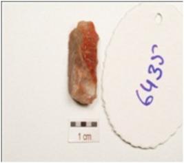 | Description / विवरण | Flake made on end struck chert flake, prominent bulb on ventral surface, flake scars on dorsal surface, use wear marks along cutting edges, triangular in section. |